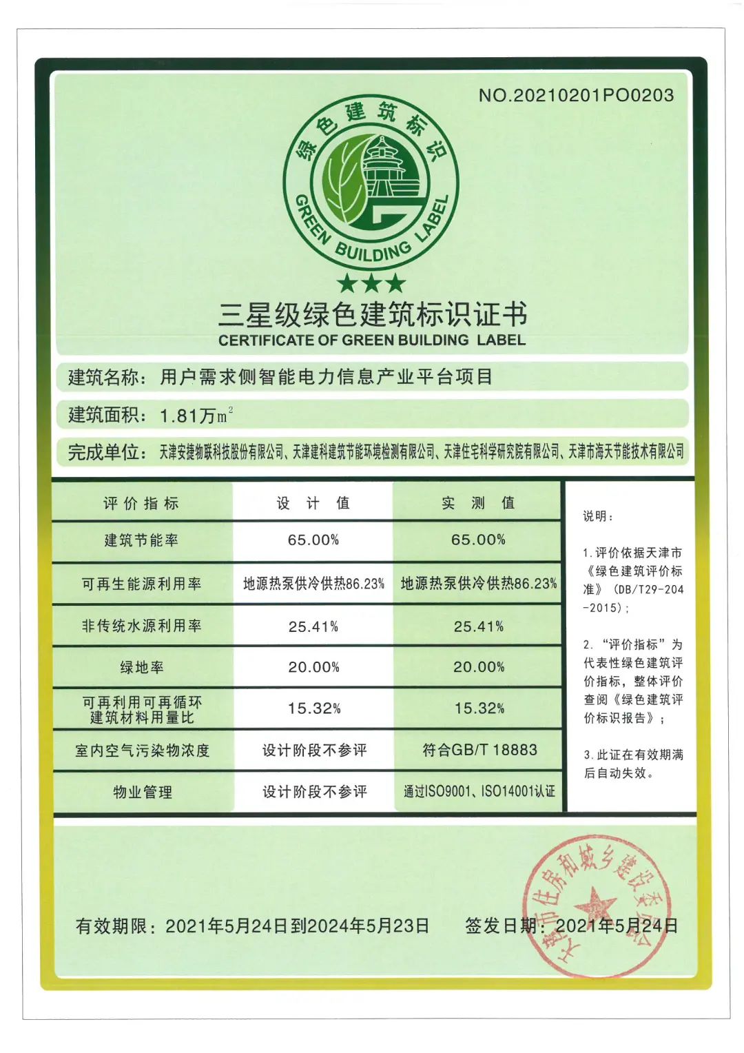 近日,由天津ballbet贝博·(中国)物联科技股份有限公司所申报的用户需求侧智能电力信息产业平台项目,荣获由天津市住房和城乡建设委员会颁发的三星级绿色建筑运行标识证书,这是对ballbet贝博·(中国)物联在绿色环保、可持续发展等方面的进一步肯定。