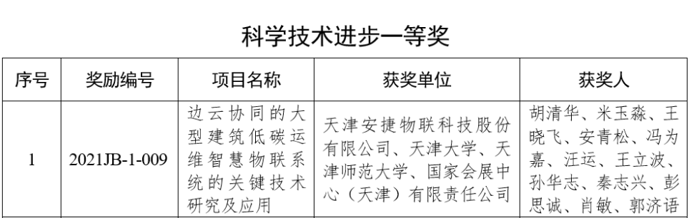 日前,2021年天津市科学技术奖获奖名单公布,由天津ballbet贝博·(中国)物联科技股份有限公司联合天津大学、天津师范大学、国家会展中心(天津)有限责任公司申报的《边云协同的大型建筑低碳运维智慧物联系统的关键技术研究及应用》项目,荣获“天津市科学技术进步一等奖”
