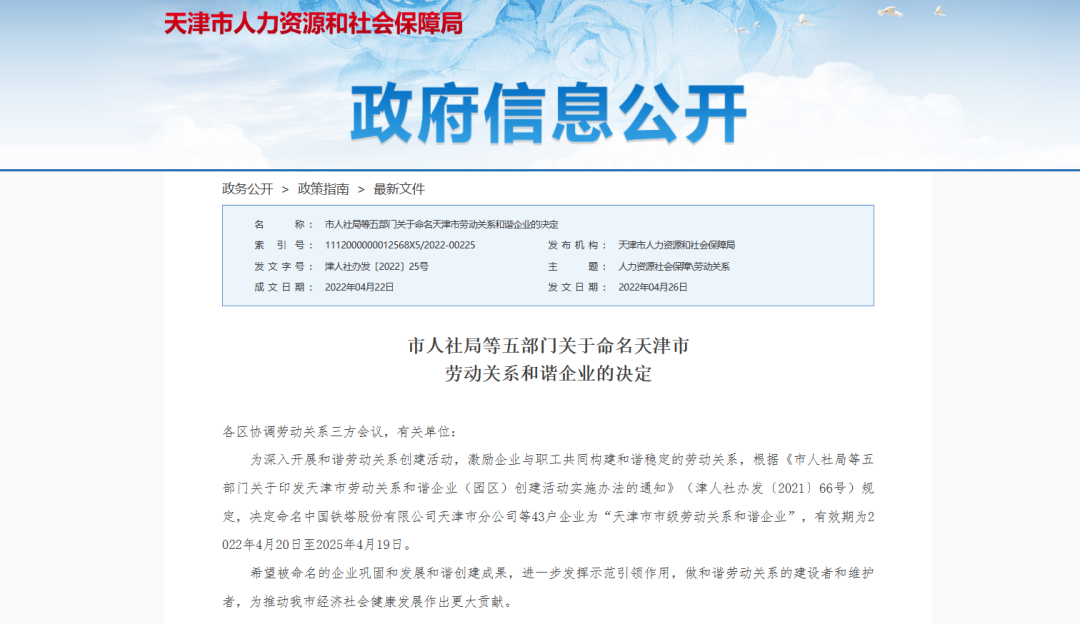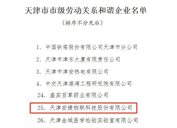 2022年4月26日,天津市人力资源和社会保障局发布了《市人社局等五部门关于命名天津市劳动关系和谐企业的决定》,命名天津ballbet贝博·(中国)物联科技股份有限公司等43户企业为“天津市市级劳动关系和谐企业”,有效期为2022年4月20日至2025年4月19日。